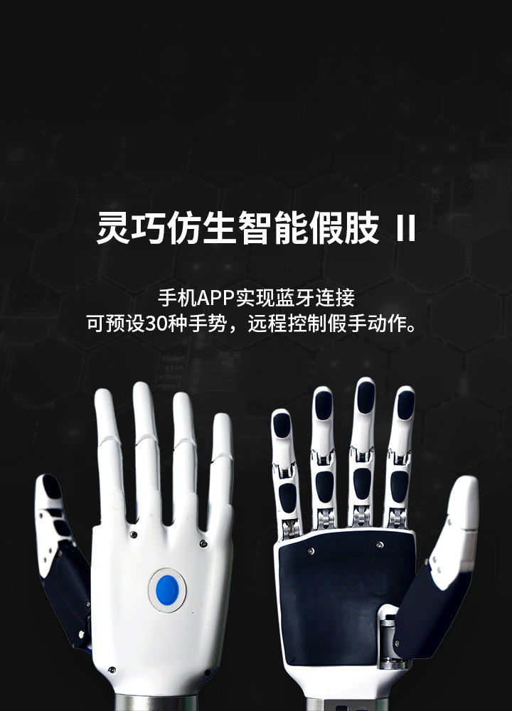 每個手指單獨(dú)驅(qū)動,動作靈活精準(zhǔn);手指關(guān)節(jié)彈力緩沖裝置,手感舒適,防碰撞;掌部和手指表面的耐磨材料具有防滑功能,抓握可靠;采用航空材料,重量輕,牢固美觀;每個手指驅(qū)動集成壓力、位置、速度等傳感器及反饋控制;拇指具有3個自由度;多模式控制,藍(lán)牙4.0連接。